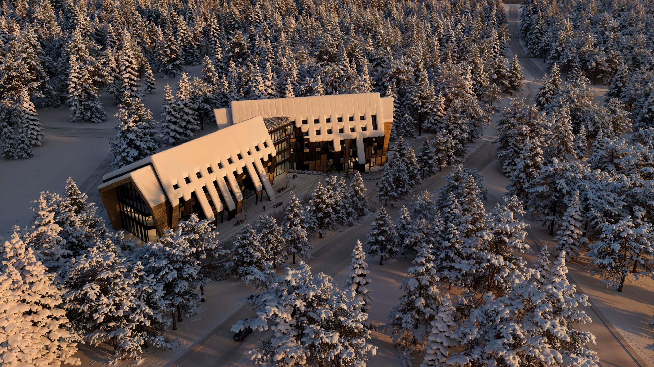 The building represents a contemporary interpretation of mountain architecture – a massive roof structure with a pronounced slope evokes traditional alpine houses, while modern materials such as wood, glass, and dark metal convey the aesthetics of sustainable and contemporary construction.