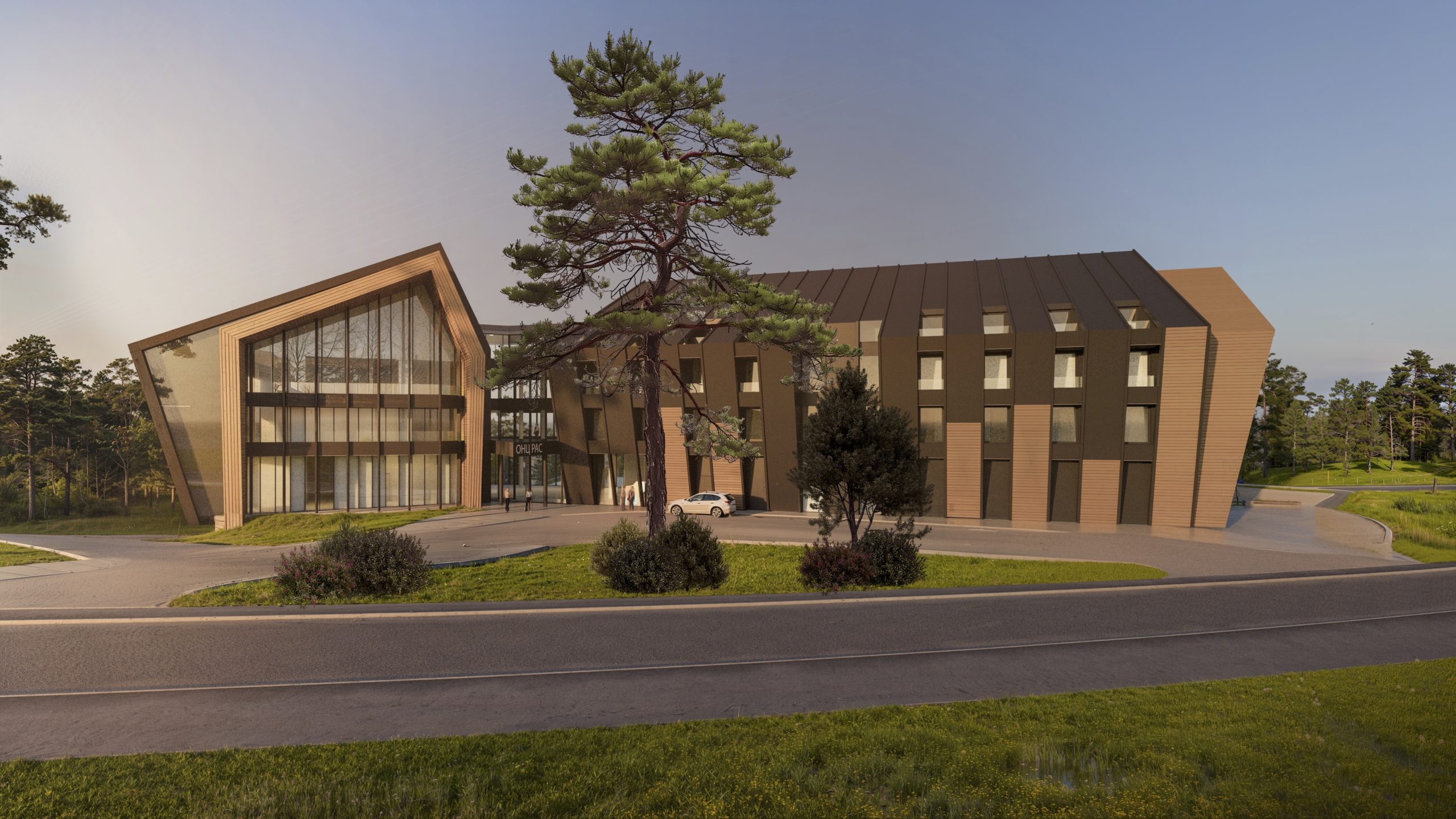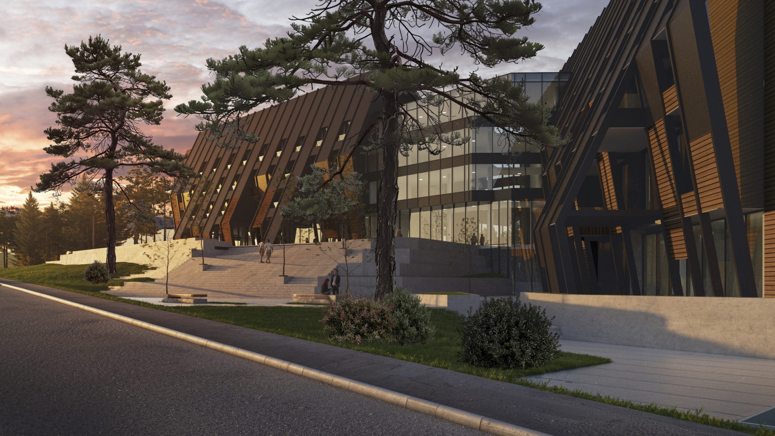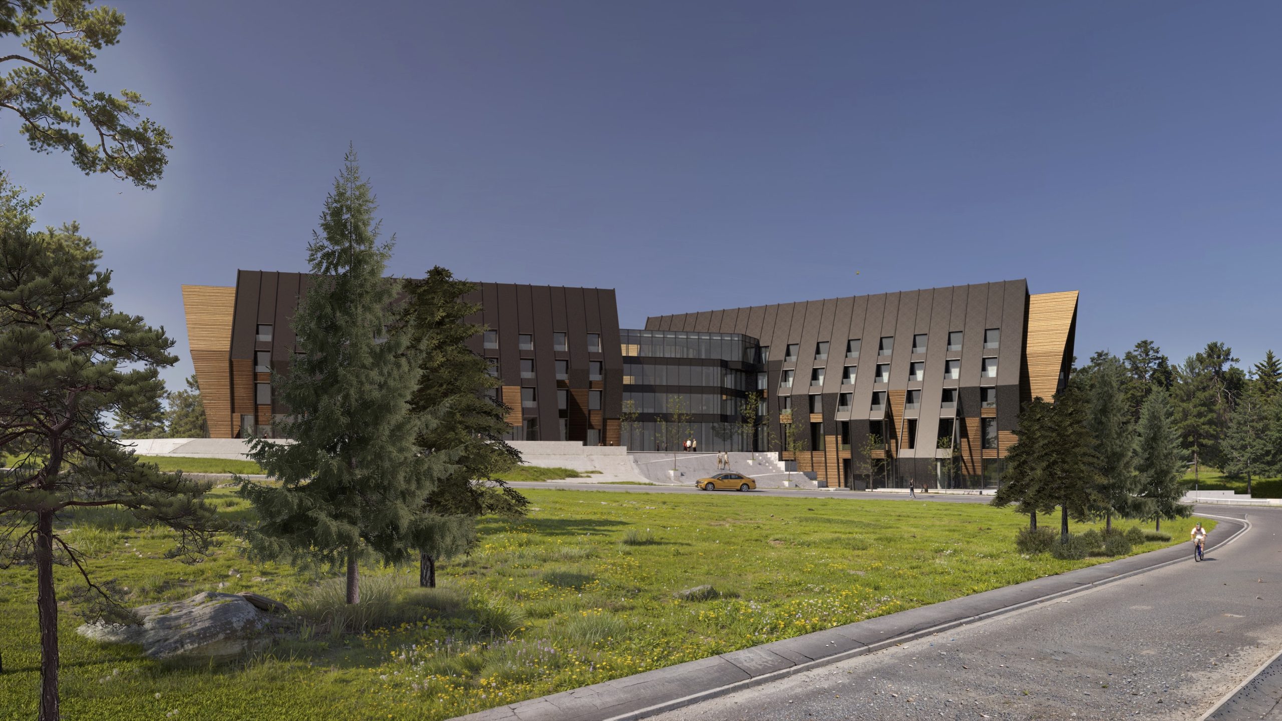 The façade combines glass surfaces, providing maximum daylight and visual connection with nature, with wooden and metal elements that emphasize the dynamism of the volume and bring warmth to the overall expression.