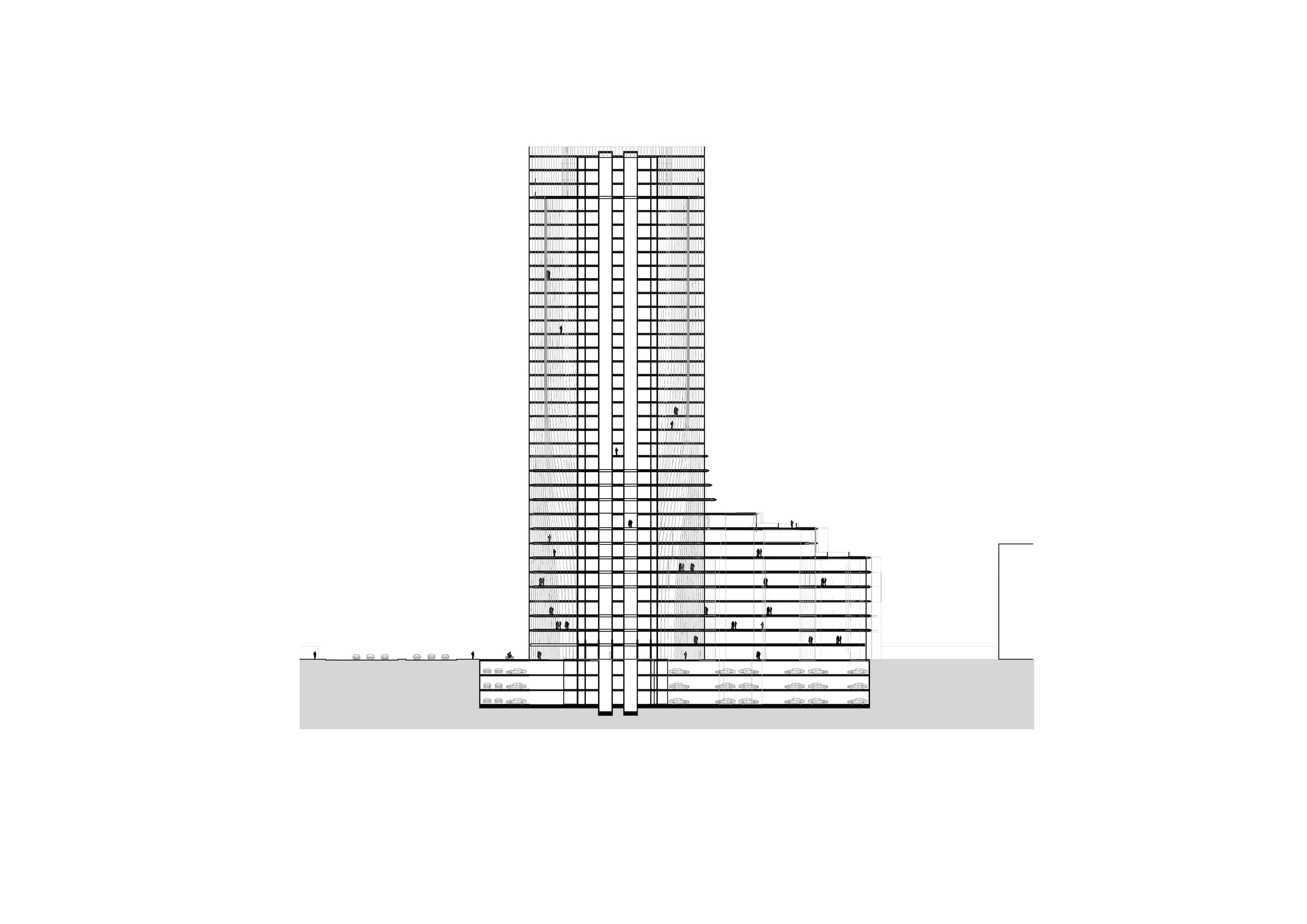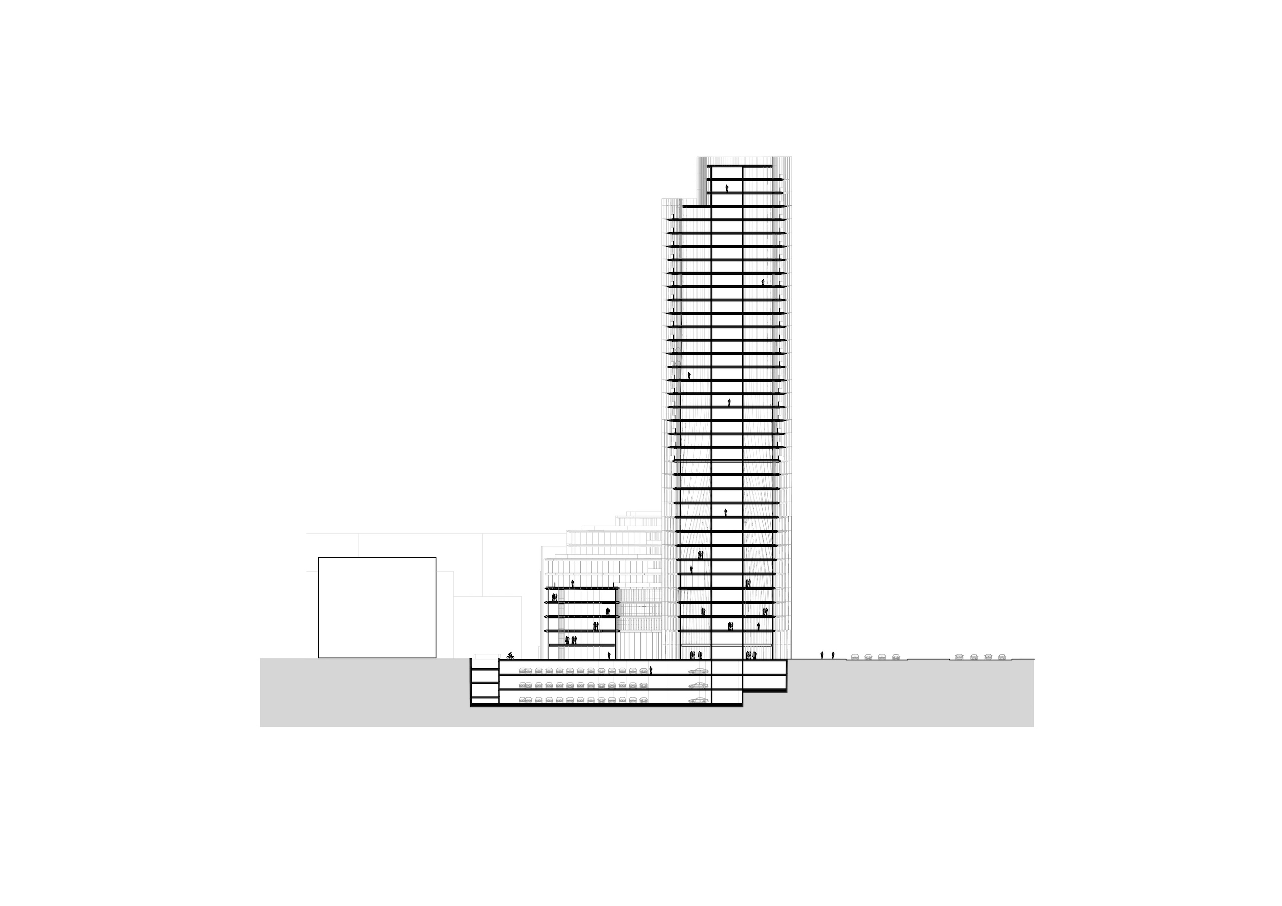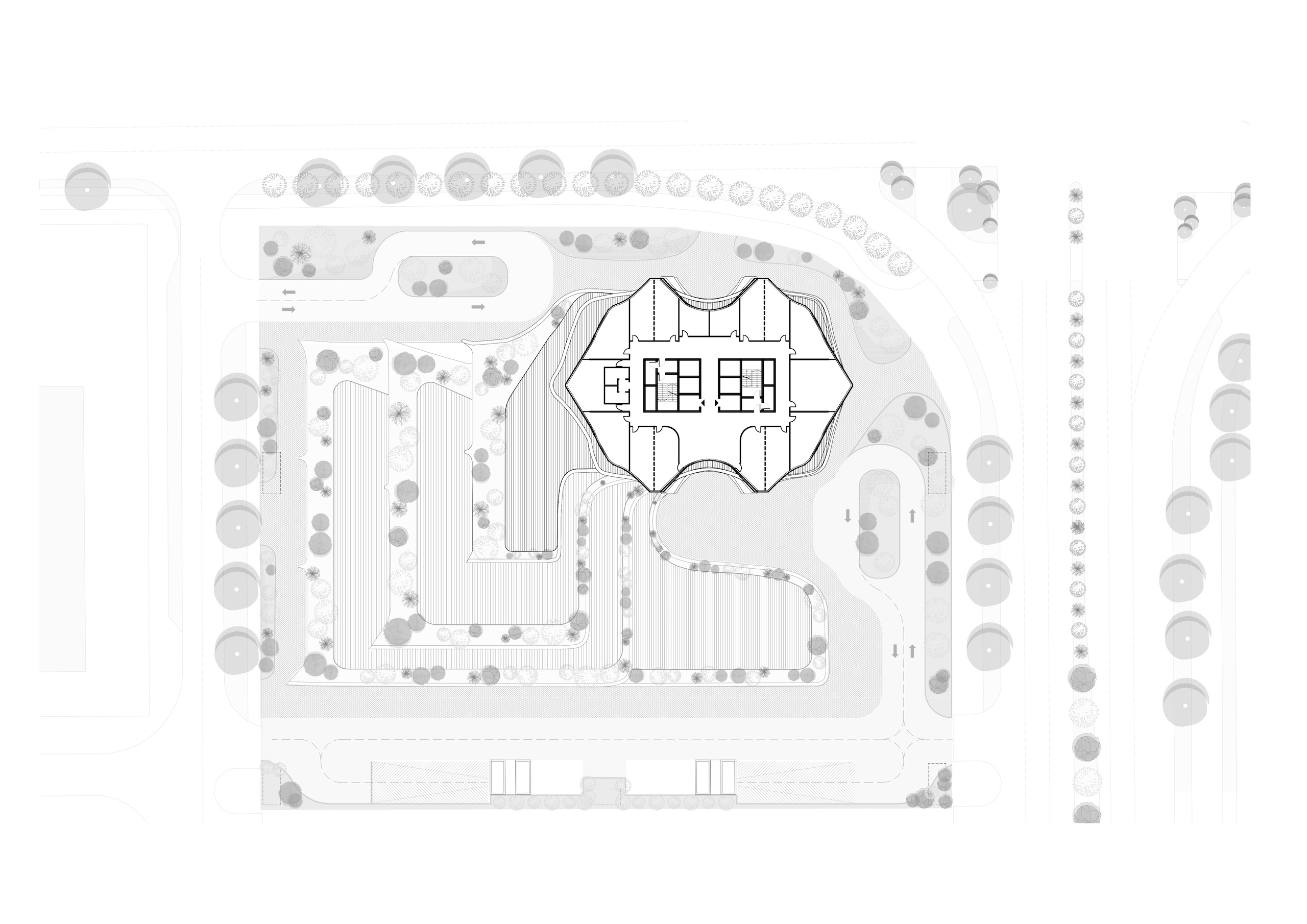 Postament objekta dimenzionalno je usklađen sa okolnim urbanim tkivom. Terase i zelene površine predviđene su za odmor i neformalne susrete, dok dizajn postamenta omogućava obilje prirodne svetlosti u enterijerima, stvarajući prijatno radno okruženje sedišta banke.