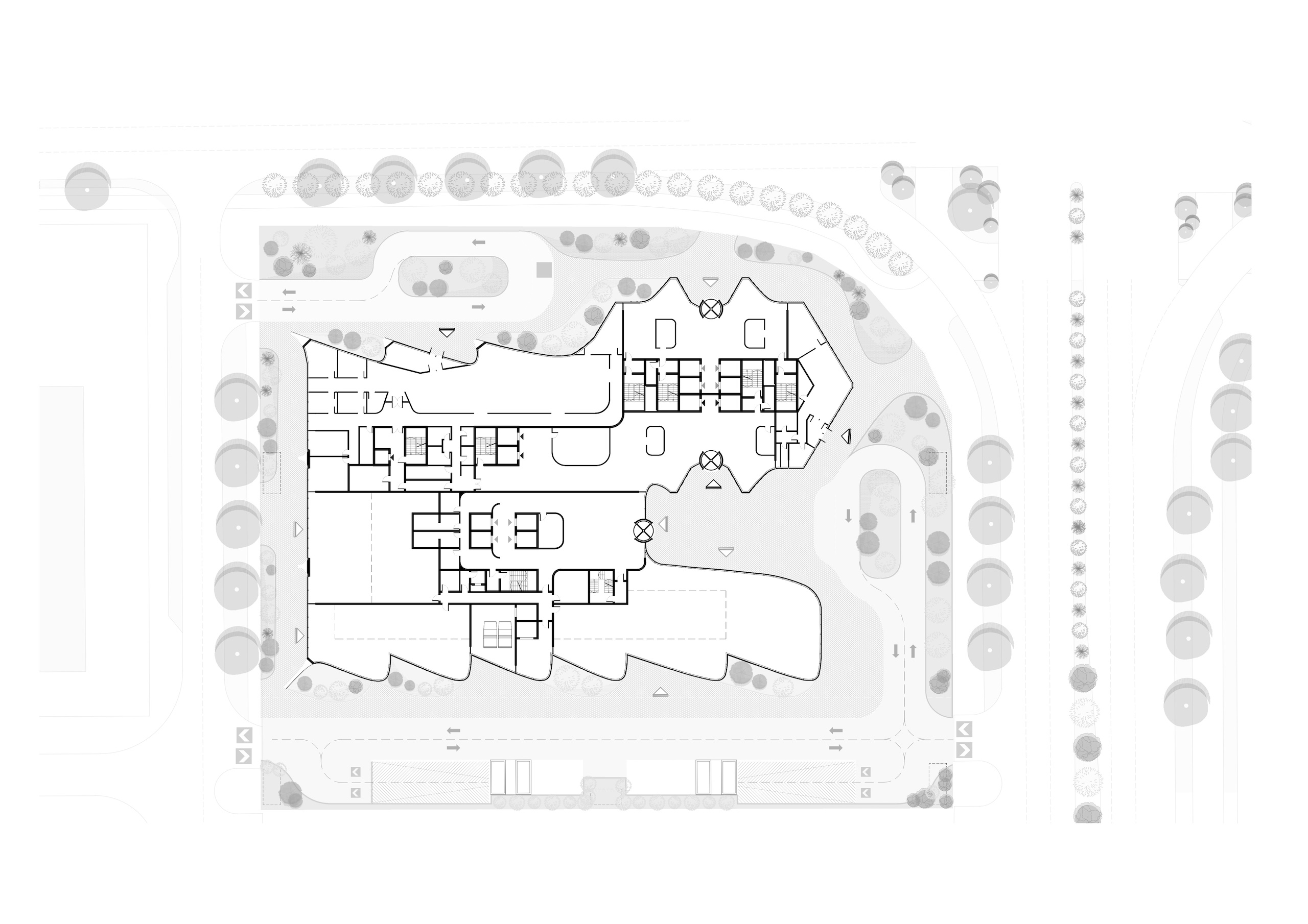 Dve ekspoziture banke, namenjene neposrednim uslugama klijentima, pozicionirane su uz Bulevar Zorana Đinđića radi optimalne pristupačnosti. Kretanje pešaka ima prioritet u odnosu na pristup vozilima, dok su javni prostori projektovani kao otvoreni i ravni, namenjeni svim korisnicima objekta – zaposlenima, stanarima i posetiocima.